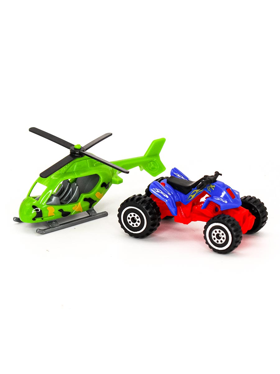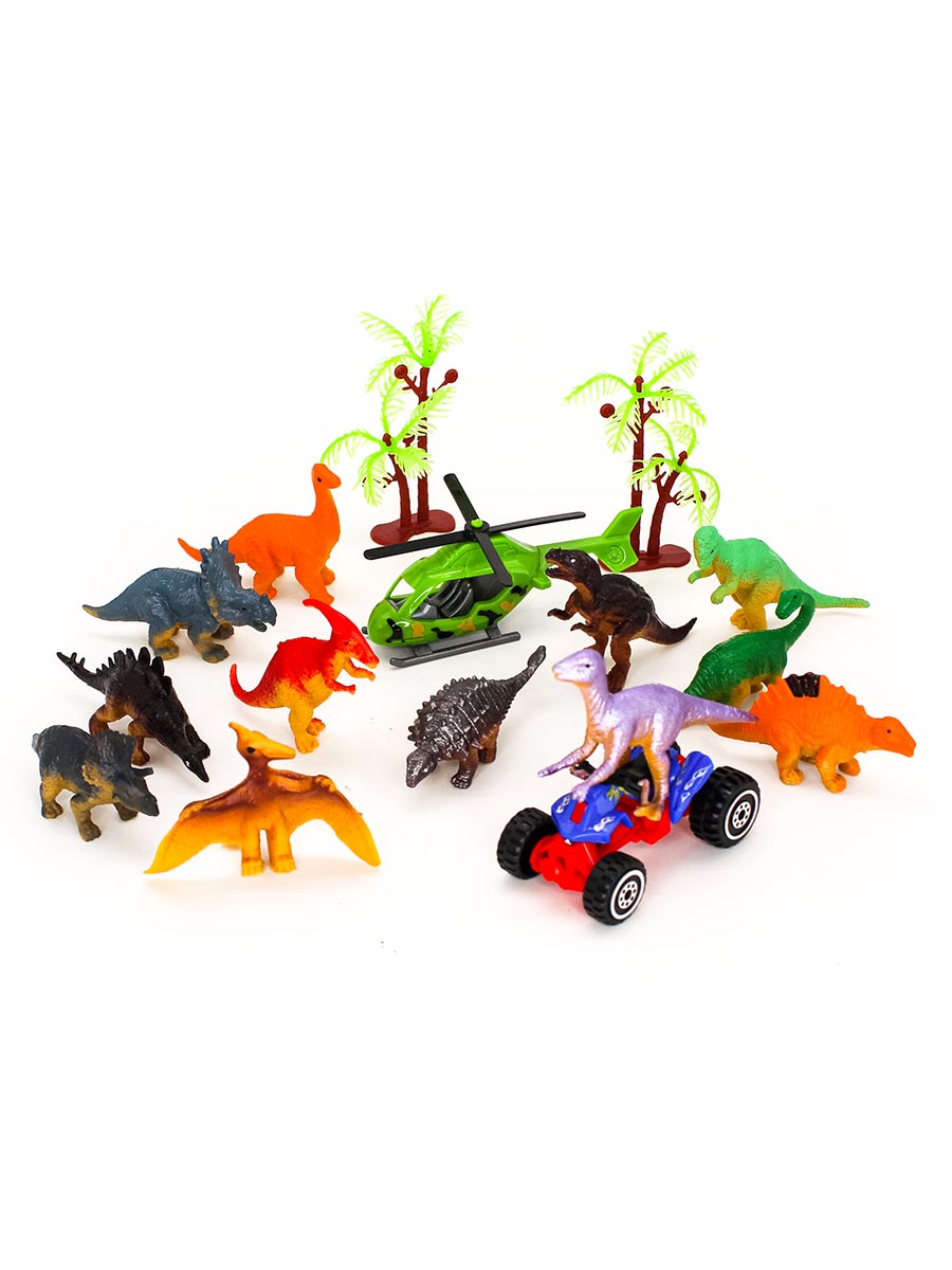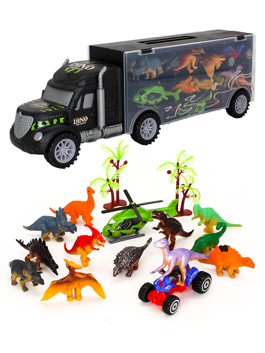 В набор входят - большой автовоз (39.5х8.5х13 см), 12 фигурок динозавров, 2 дерева, вертолет, квадроцикл, игровое поле для настольной игры.Автовоз оснащен специальными отсеками для хранения динозавров. Прозрачные дверцы обеспечивают легкий доступ к игрушкам. Ячейки для фигурок расположены с двух сторон грузовика. Сверху грузовика есть ручка для переноски.