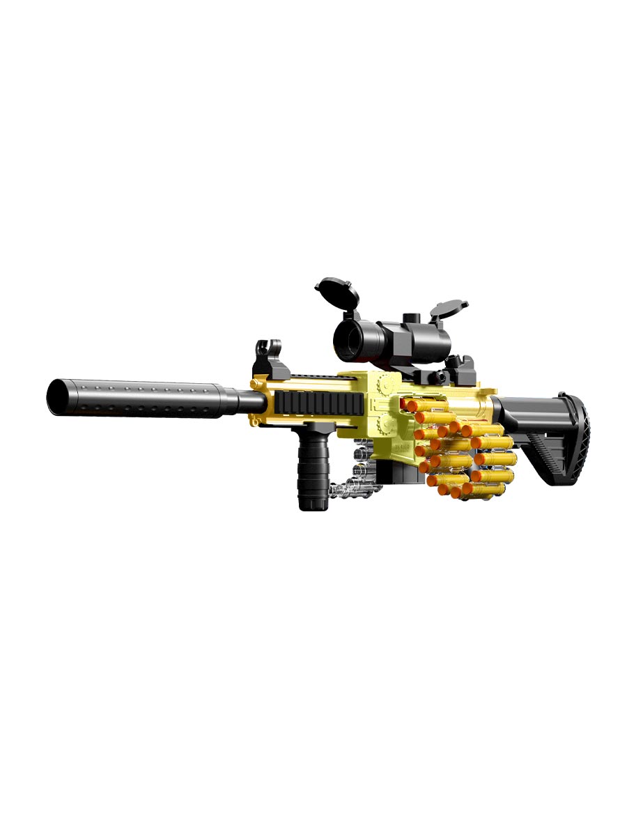 Штурмовая винтовка М416 – разновидность игрушечного оружия, которое стреляет мягкими пулями на присосках. Внешний вид максимально приближен к настоящему оружию – есть патронная лента, оптический прицел, глушитель, ремень для ношения на плече и т.д. В комплекте 24 мягких патронов из экологичного материала EVA. Такие пули безопасны для здоровья ребенка и не причинят ему вреда. Дальность стрельбы 8-10 метров. Стрельба автоматическая. Два варианта стрельбы - одиночными выстрелами или непрерывной очередью. В магазин для патронов одновременно вмещается 24 пули. Винтовка сборная – состоит из девяти частей и легко складывается для компактного хранения вне игры. Вес у винтовки совсем небольшой и подойдет для игры детям с 6 лет. Работает от аккумулятора. Отсек аккумулятора находится в рукояти винтовки. USB-зарядка для аккумулятора в комплекте.Характеристики