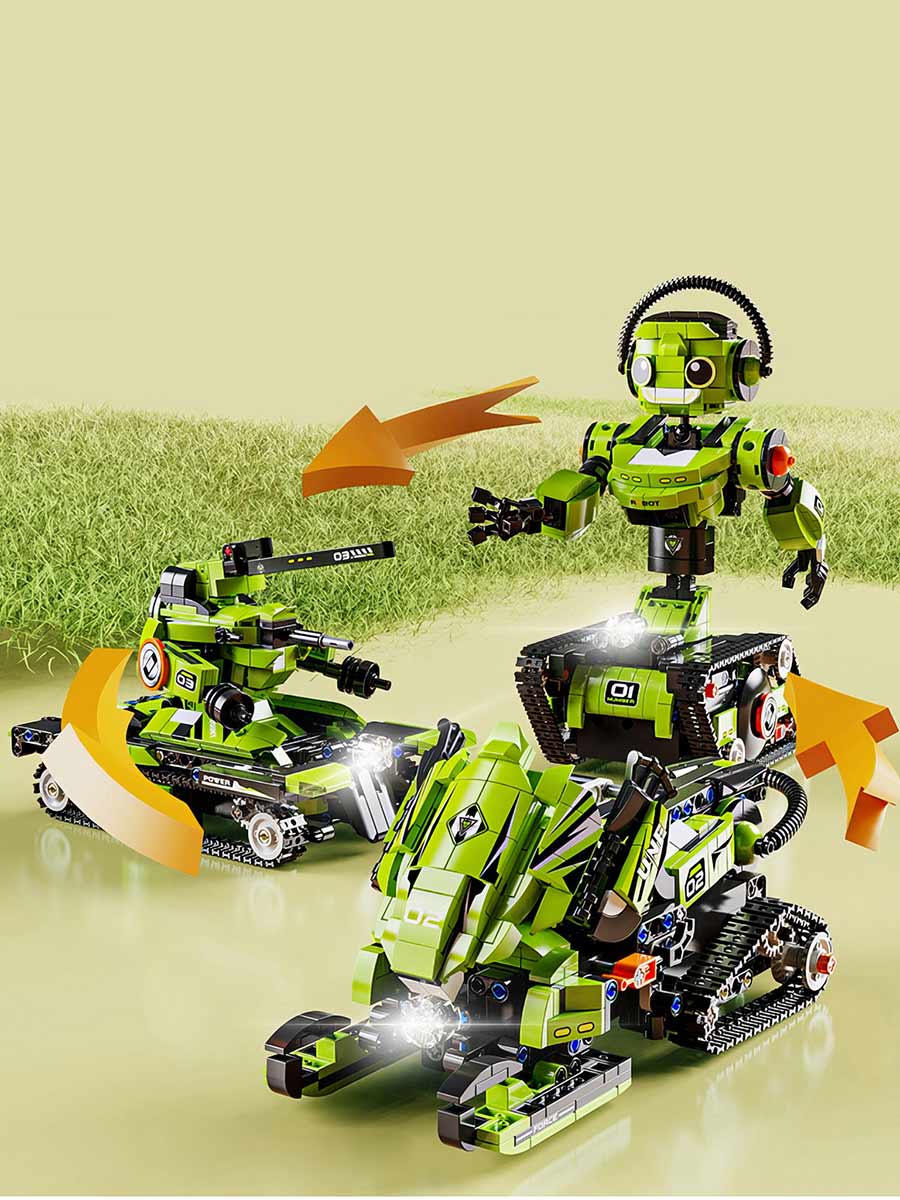 Конструктор «Робот-трансформер 3в1» на пульте управления — отличный подарок для мальчика! Он развивает навыки инженерии, логическое мышление и творчество. Этот детский конструктор позволяет создать уникального робота и оживить его с помощью дистанционного управления. Конструктор предусматривает три разных робота в одном наборе – собрать одновременно можно один вариант по выбору.Конструктор содержит 856 деталей, совместимых с Лего. Детали конструктора легко соединяются, что позволяет ребёнку самостоятельно собирать и модифицировать робота, развивая свои творческие способности. У конструкции робота предусмотрены шарнирные соединения для изменения положения рук, головы и туловища. Это расширяет поле для фантазии в игре.