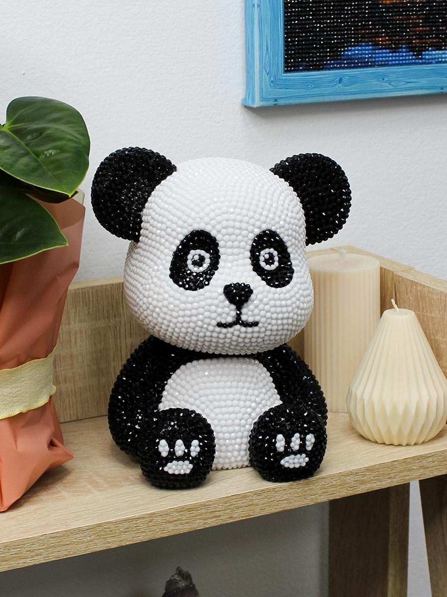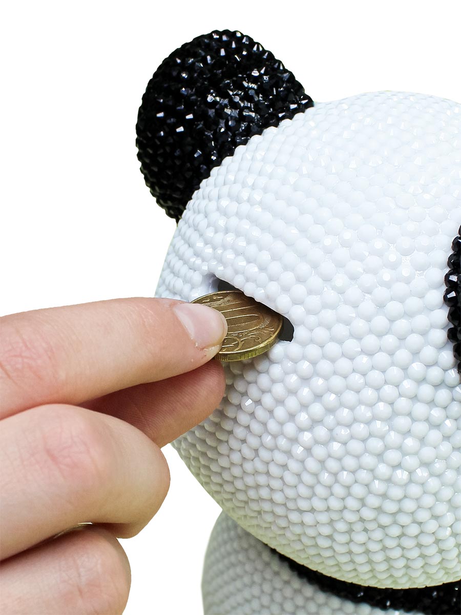 Кроме этого, Панда Шайни - это эффектный и долговечный аксессуар в интерьер и КОПИЛКА! Стразы со временем не тускнеют и при направленном освещении переливаются и блестят. А копилка - полезная функция и воспитывает бережливость и финансовую грамотность. Копилка многоразовая с крышкой.