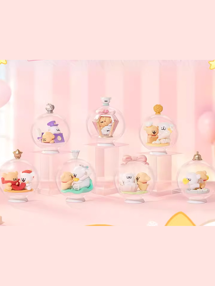Каждая фигурка высотой около 10 см помещена внутрь прозрачной сферы, напоминающей кристалл или волшебный снежный шар. Сферы увенчаны уникальными вершинками - звездой, бантом, месяцем или крошечной головкой собачки, — которые делают каждый экземпляр особенным. Но главная магия скрывается внутри: прозрачную сферу можно разобрать и достать фигурки персонажей, чтобы использовать их как отдельные элементы декора или играть с ними.