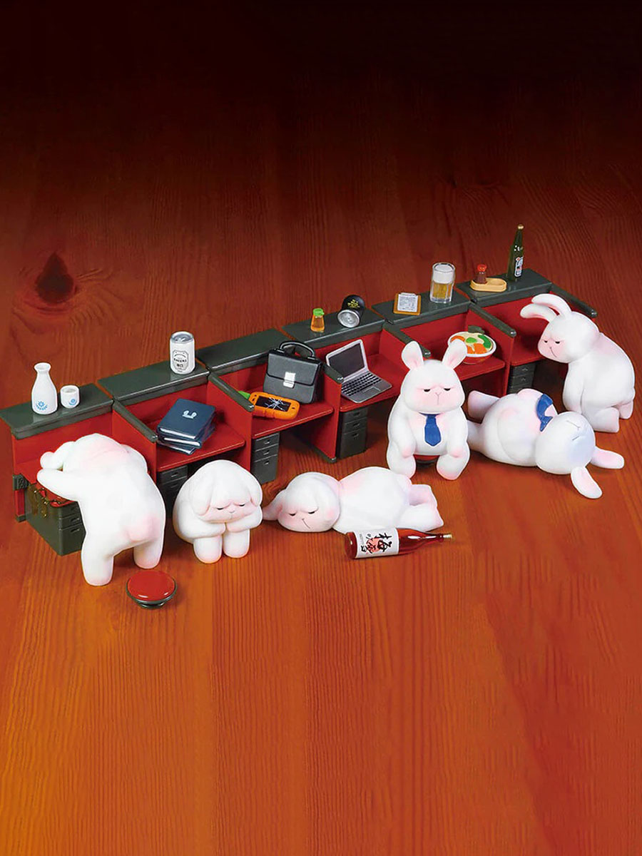 Каждая фигурка высотой около 8 см выполнена из высококачественного ПВХ и АБС-пластика с уникальным флокированным покрытием, имитирующим мягкую пушистую шерстку. Это покрытие невероятно приятно на ощупь и придаёт фигуркам особый уютный шарм. В комплекте с каждым кроликом идут тематические аксессуары: еда и напитки, помогающие забыть о трудовых буднях. И конечно, именная карточка - удостоверение личности уставшего работяги.