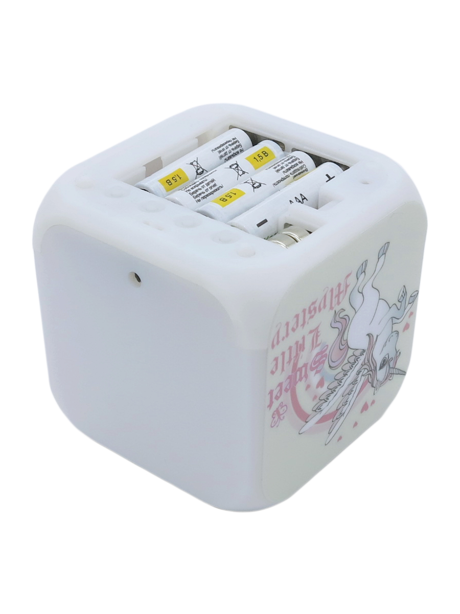 Добавь к себе на полку любимого персонажа! Оригинальный принт с единорожкой и разные режимы работы подсветки окрасят вашу комнату новыми красками. Подсветка будильника работает в двух режимах: постоянное изменение цветов подсветки и затухание подсветки, которую можно включить нажатием на будильник. Режимы подсветки можно переключать кнопками на панели управления, которая находятся на нижней стороне часов. LED экран работает от 2 батареек типа AG13, подсветка питается от 4 батареек типа AAA (в комплект не входят).ЖК дисплей. Функции: часы, будильник, термометр, календарь. Несколько мелодий.