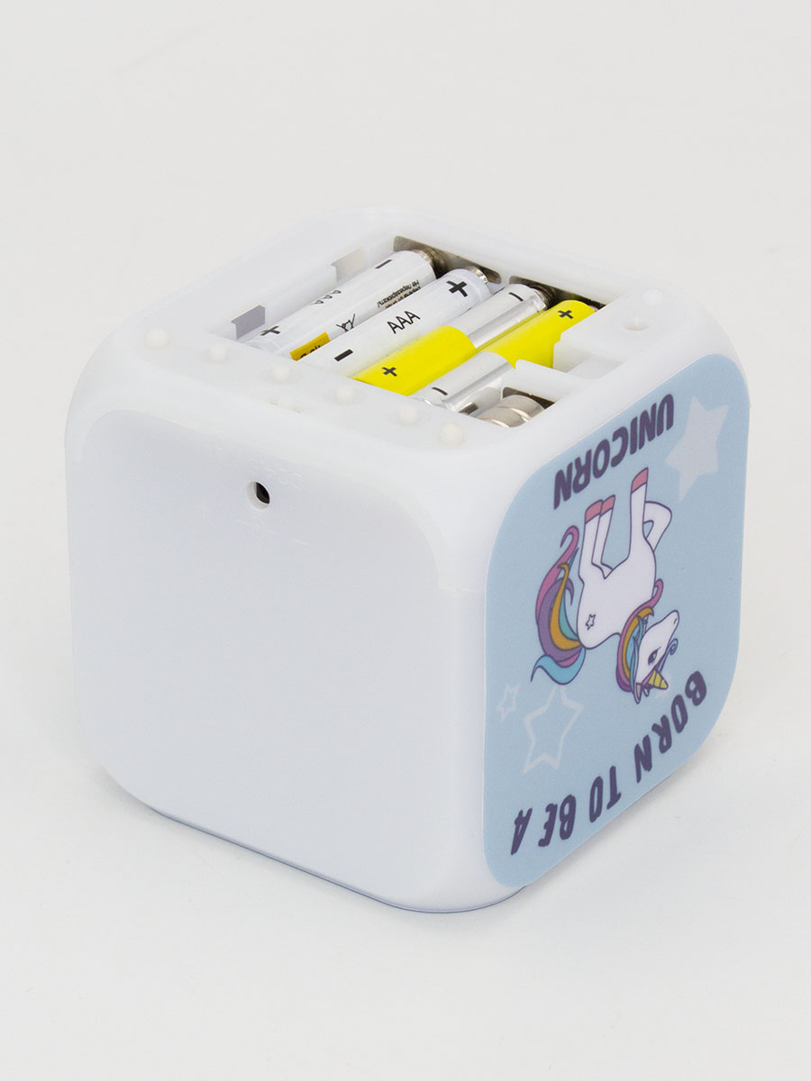Добавь к себе на полку любимого персонажа! Оригинальный принт с единорожкой и разные режимы работы подсветки окрасят вашу комнату новыми красками. Подсветка будильника работает в двух режимах: постоянное изменение цветов подсветки и затухание подсветки, которую можно включить нажатием на будильник. Режимы подсветки можно переключать кнопками на панели управления, которая находятся на нижней стороне часов.LED экран работает от 2 батареек типа AG13, подсветка питается от 4 батареек типа AAA (в комплект не входят).ЖК дисплей. Функции: часы, будильник, термометр, календарь. Несколько мелодий.