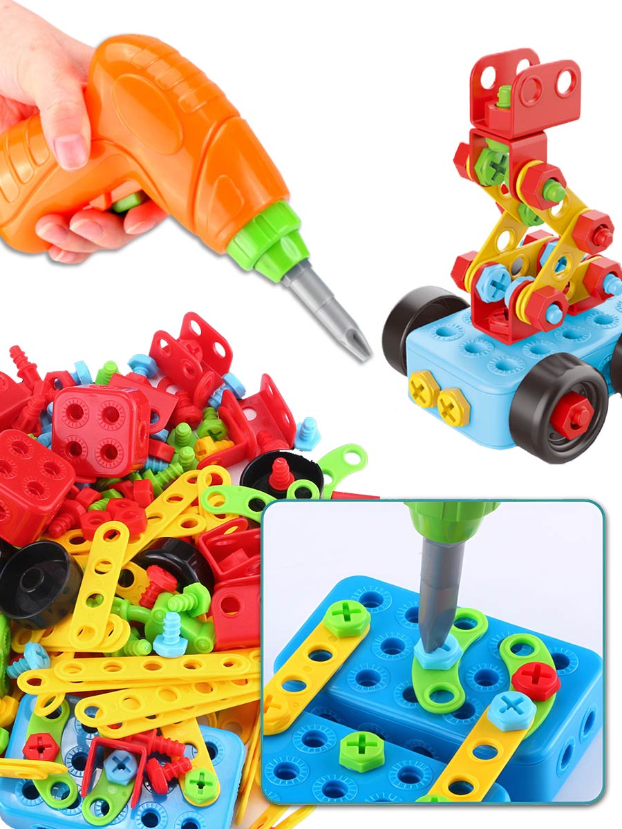 Детский винтовой конструктор с шуруповёртом — увлекательная и полезная игрушка для развития малышей.В наборе 288 деталей, удобный шуруповёрт с двумя различными насадками, работающими от двух батареек типа АА (входят в комплект), отвёртка и гаечный ключ, болты и гайки, а также цветные инструкции с картинками.