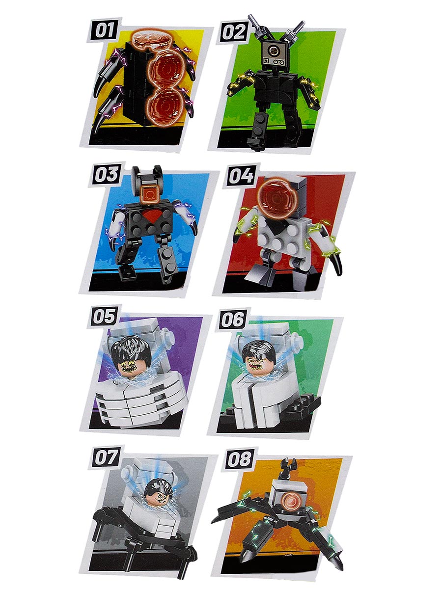 Конструктор Скибиди Туалет Персонажи продается в формате блайнд-боксов. Blind box – формат, в котором игрушки продаются в непрозрачных упаковках. Сюрприз – основа блайнд-боксов. Каждый мини набор включает в себя около 30 деталей, позволяющих собрать Скибиди туалет, Камерамена, Камерамена паука, Спикермена, или других уникальных героев. Всего в коллекции 8 фигурок-персонажей. Что достанется именно вам – никому не известно. У собранных фигурок подвижные руки, ноги и голова и т.д., что добавляет реализма и позволяет использовать их в игровом процессе.