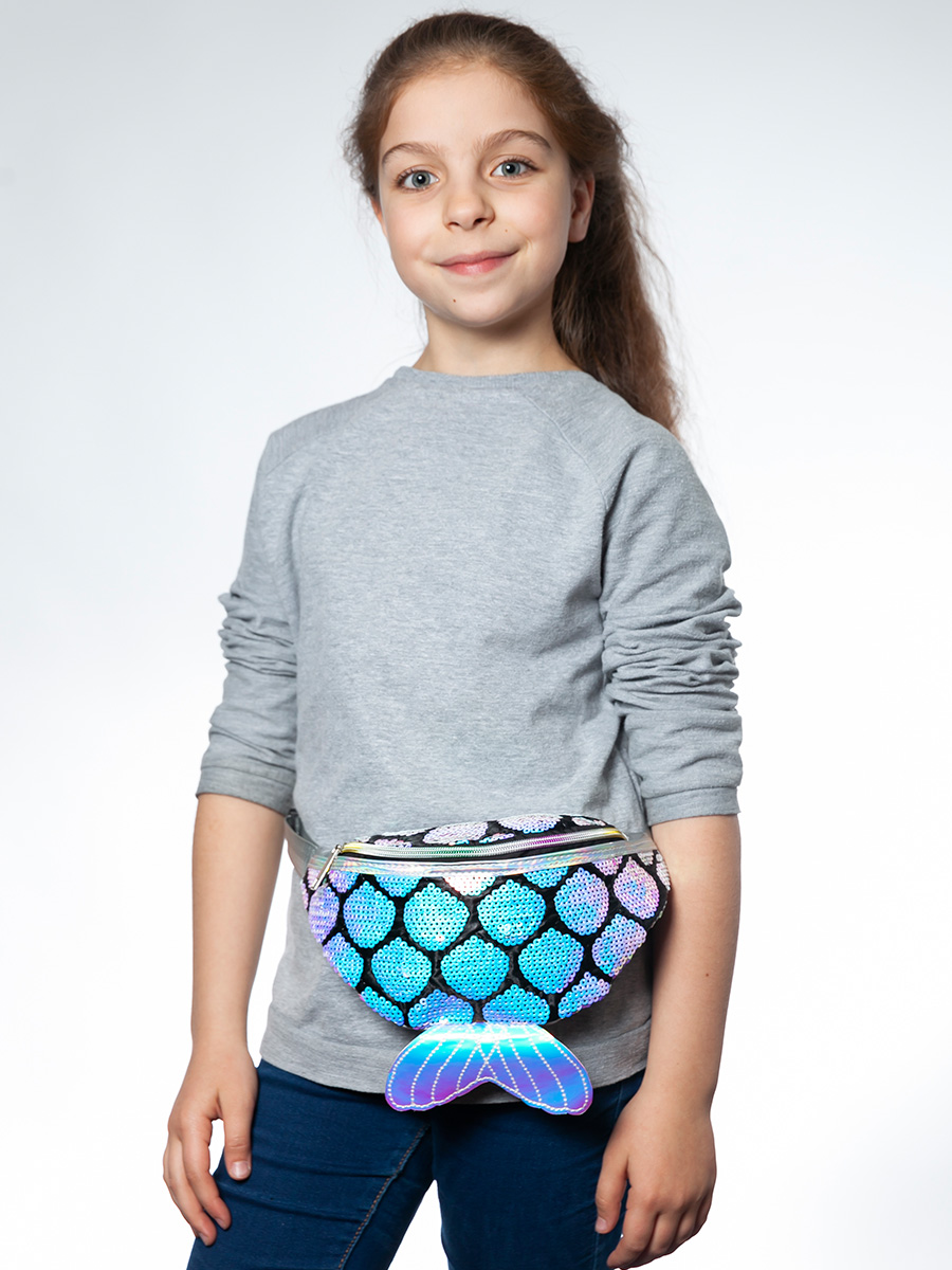 Милая поясная сумочка с хвостиком Русалочки и переливающимися пайетками гармонично смотрится на девочках любых возрастов!У сумочки одно большое отделение на молнии для самых нужных вещей.