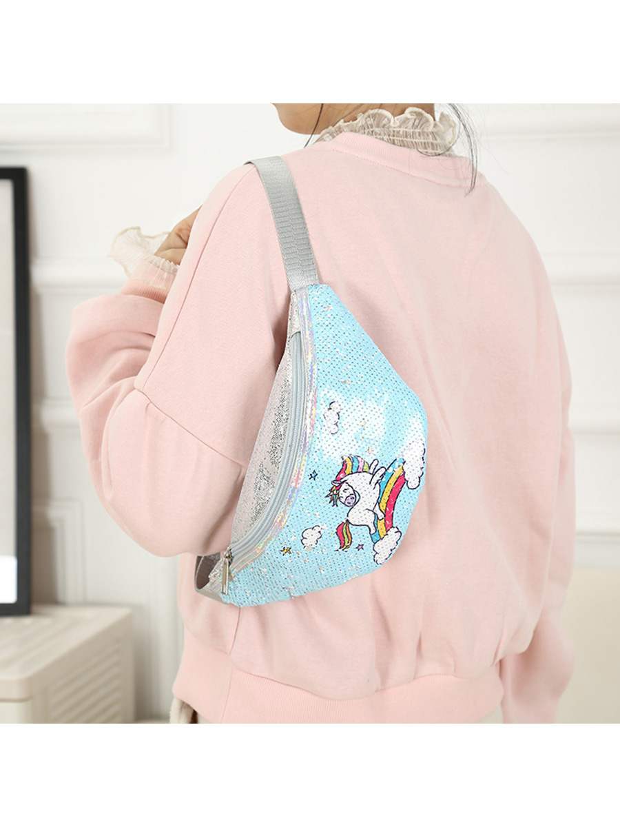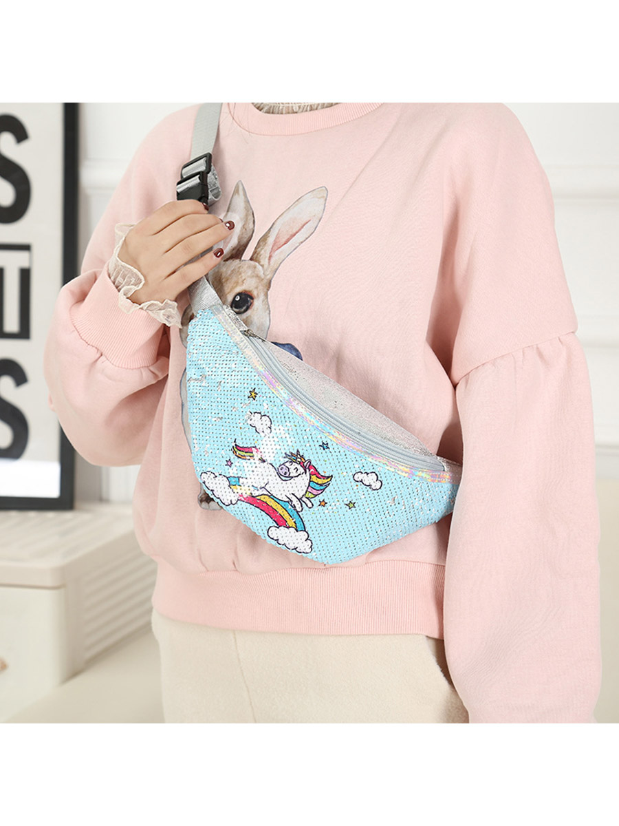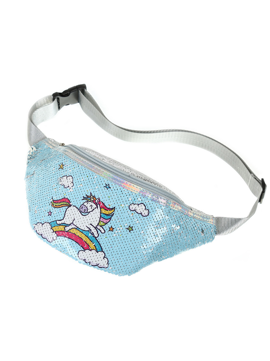 Сумочка поясная с пайетками Единорог бегущий по радуге голубая