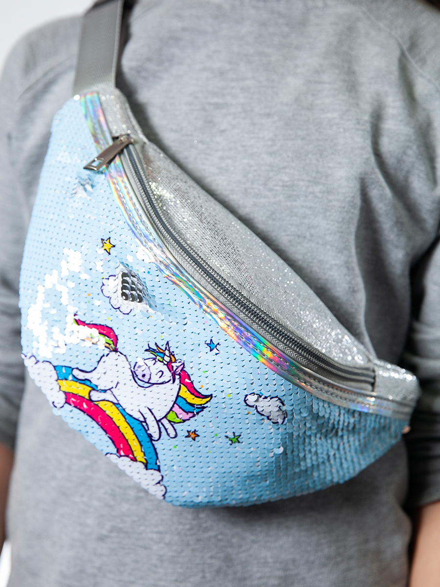 купить Сумочка поясная с пайетками Единорог бегущий по радуге голубая оптом со склада в Москве с доставкой в любой регион.